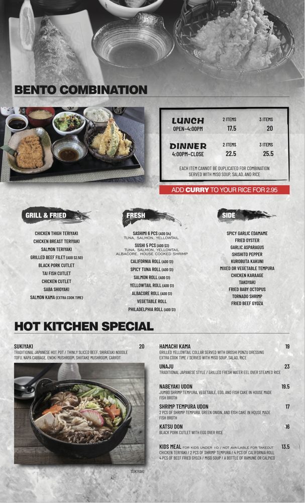 unagi special roll, zen sashimi roll, double salmon roll, black spider roll, fried unagi roll, hungry monster roll, 2 pieces tuna sushi, 2 pieces salmon sushi, pieces seared albacore sushi, 2pieces yellowtail 3 pieces tuna sashimi, 3 pieces salmon sashimi, 3 pieces seared albacore sashimi, 3 pieces yellowtail sashimi