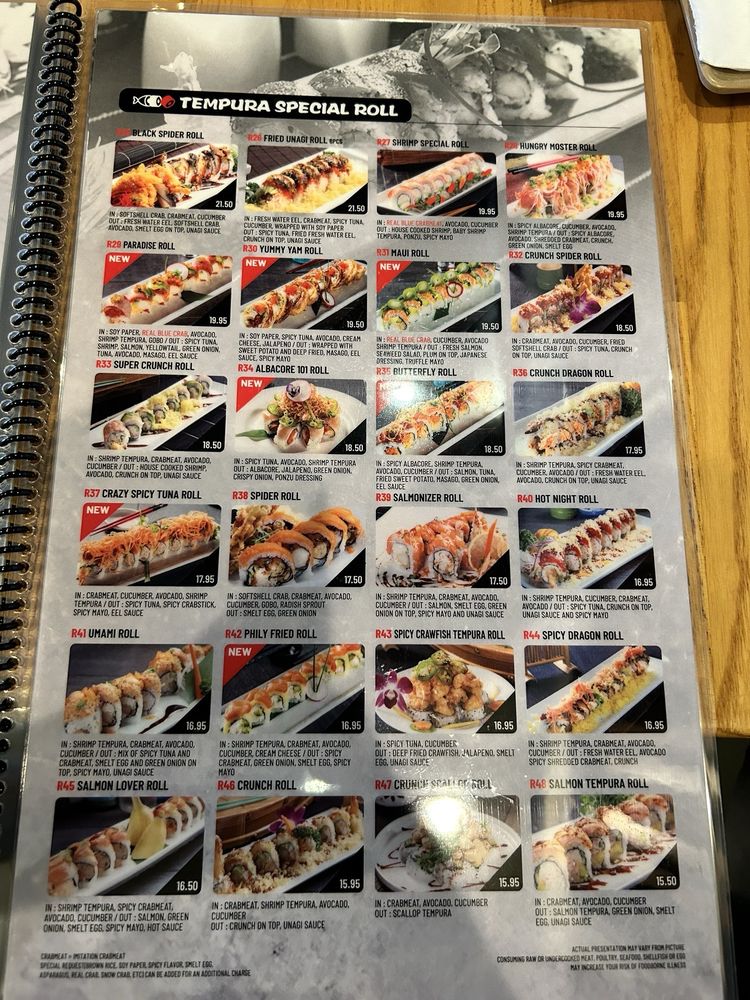 zen sashimi rooll, mon on fire roll, double salmon roll, rainbow roll paradise roll, crazy spicy tuna roll, crunch dragon rollsushi: tuna 2, salmon 2, albacore 2 yellowtail 2