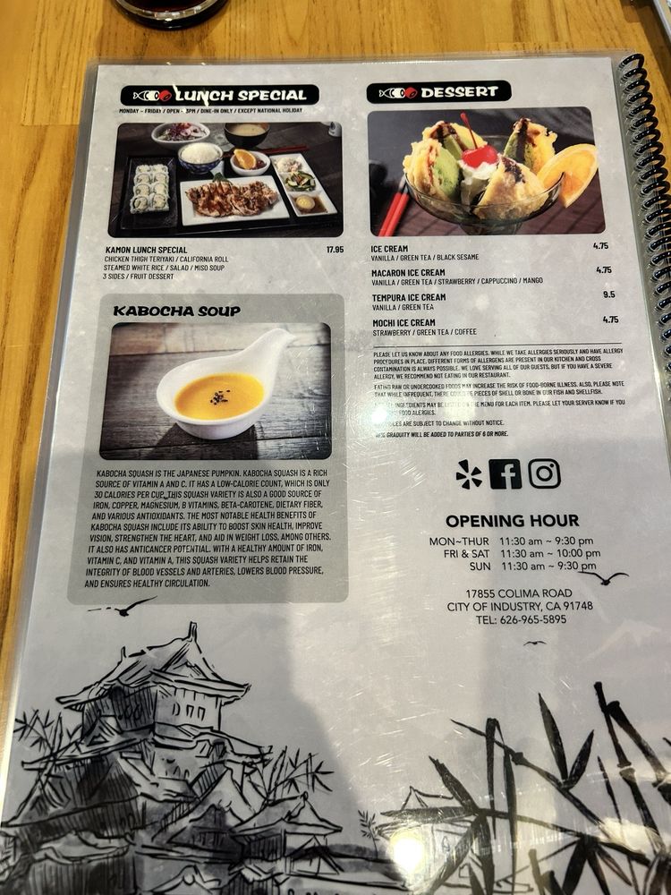 Kamon Sushi, located at 17855 Colima Rd in the City of Industry, CA, offers an exquisite culinary journey that transcends the conventional sushi experience. Their menu highlights the vibrant and fresh flavors of Japan, featuring a variety of salads and small dishes that will tantalize your taste buds.